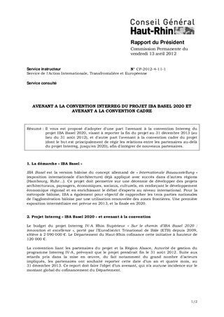 Il vous est proposé d'adopter d'une part l'avenant à la convention Interreg du projet IBA Basel 2020, visant à reporter la fin du projet au 31 décembre 2013 (au lieu du 31 août 2012), et d'autre part l'avenant à la convention cadre du projet (dont le but est principalement de régir les relations entre les partenaires au-delà du projet Interreg, jusqu'en 2020), afin d'intégrer de nouveaux partenaires.