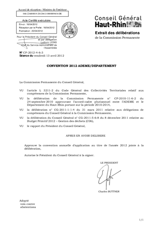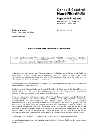 Conformément à l’Accord Cadre signé entre l’ADEME et le Département du Haut-Rhin sur la période 2010-2014, le présent rapport propose l’approbation de la convention annuelle d’application au titre de l’année 2012.