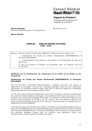 Dans le cadre de la démarche GERPLAN, le Département est sollicité pour : - l’amélioration de l’accès aux fermes Bruckenwald (NIEDERBRUCK) et Fennemat (DOLLEREN), - la sensibilisation des enfants et des adultes à l’environnement du pays du Ried Brun. Il vous est proposé de financer ces demandes pour un montant total de 21.981,60 €.