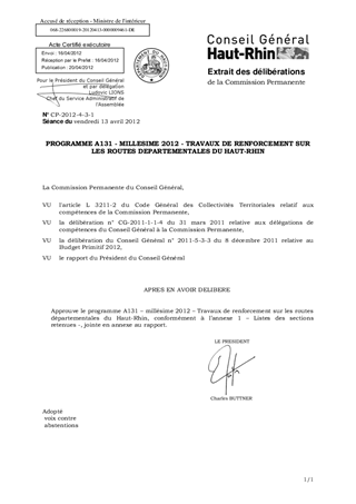 PROGRAMME A131 - MILLESIME 2012 - TRAVAUX DE RENFORCEMENT SUR LES ROUTES DEPARTEMENTALES DU HAUT-RHIN