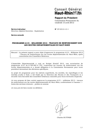 Le présent rapport a pour objet d'approuver le programme A131 - Millésime 2012 - Travaux de renforcement sur les routes départementales du Haut-Rhin, après consultation des Conseillers Généraux.