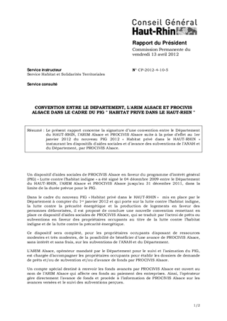 Le présent rapport concerne la signature d’une convention entre le Département du HAUT-RHIN, l’ARIM Alsace et PROCIVIS Alsace suite à la prise d’effet au 1er janvier 2012 du nouveau PIG 2012 « Habitat privé dans le HAUT-RHIN » instaurant les dispositifs d'aides sociales et d’avance des subventions de l’ANAH et du Département, par PROCIVIS Alsace.