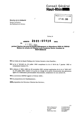 portant fixation des prix de journée hébergement et dépendance 2006 de l'EHPAD maison de retraite de l'hôpital local Fondation Xavier Jourdain de NEUF-BRISACH. Resumé Pièces jointes ARRETE Assemblée : Non défini Date : 27/12/2005 Rapporteur : Non défini Collectivité : Conseil départemental du Haut-Rhin Direction : Non défini Service : Service de la Tarification des Etablissements Domaine : Prix de Journée Commission :
