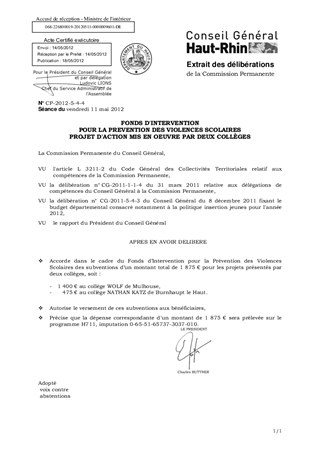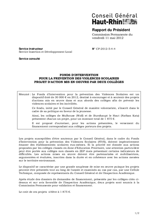 Le Fonds d'Intervention pour la prévention des Violences Scolaires est un dispositif doté de 30 000 € en 2012, destiné à encourager et à soutenir des projets d'actions mis en œuvre dans et aux abords des collèges afin de prévenir les violences scolaires et les incivilités. Ce fonds, initié par le Conseil Général de manière volontariste, s’inscrit dans le cadre de sa politique en faveur de la jeunesse. Ainsi, les collèges de Mulhouse (Wolf) et de Burnhaupt le Haut (Nathan Katz) présentent chacun un projet, pour un montant total de 1 875 €. Il est proposé d'autoriser, pour les actions présentées, le versement du financement correspondant aux collèges porteurs des projets.