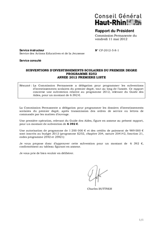 La Commission Permanente a délégation pour programmer les subventions d’investissements scolaires du premier degré, tout au long de l’année. Ce rapport concerne une subvention relative au programme 2012, relevant du Guide des Aides, pour un montant de 6 392 €.