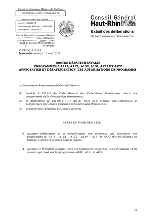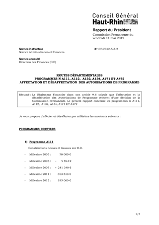 Le Règlement Financier dans son article 9.6 stipule que l’affectation et la désaffectation des Autorisations de Programme relèvent d’une décision de la Commission Permanente. Le présent rapport concerne les programmes N A111, A112, A132, A134, A171 ET A472