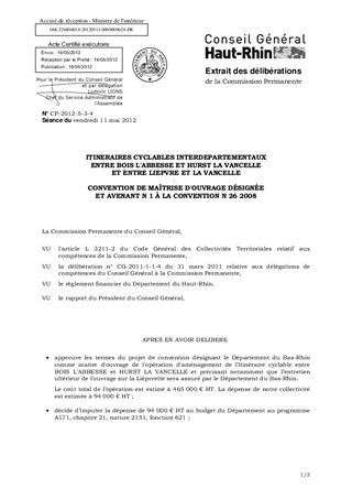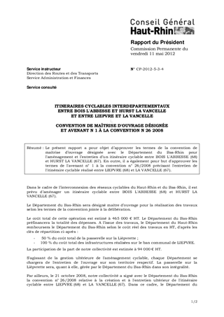 Le présent rapport a pour objet d’approuver les termes de la convention de maîtrise d’ouvrage désignée avec le Département du Bas-Rhin pour l'aménagement et l’entretien d’un itinéraire cyclable entre BOIS L'ABBESSE (68) et HURST LA VANCELLE (67). En outre, il a également pour but d'approuver les termes de l'avenant n° 1 à la convention n° 26/2008 précisant l'entretien de l'itinéraire cyclable réalisé entre LIEPVRE (68) et LA VANCELLE (67).