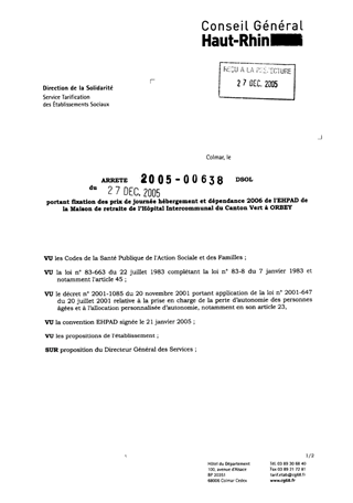 portant fixation des prix de journée hébergement et dépendance 2006 de l'EHPAD de la maison de retraite de l'hôpital intercommunal du canton Vert à ORBEY. Resumé Pièces jointes ARRETE Assemblée : Non défini Date : 27/12/2005 Rapporteur : Non défini Collectivité : Conseil départemental du Haut-Rhin Direction : Non défini Service : Service de la Tarification des Etablissements Domaine : Prix de Journée Commission :