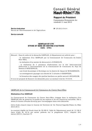 Dans le cadre de la démarche GERPLAN, le Département est sollicité pour : - la réalisation d’un GERPLAN par la Communauté de Communes du Centre Haut-Rhin, - la réalisation d’un sentier de découverte à JUNGHOLTZ, - la réalisation de 3 panneaux d’information sur le site intercommunal d’éducation à l’environnement de la Communauté de Communes du Pays de Sierentz à KOETZINGUE, - une étude faunistique et floristique sur la réserve de chasse de SCHLIERBACH, - un aménagement paysager aux abords de 2 calvaires à GEISPITZEN, - la formation des usagers des jardins familiaux au jardin naturel à MULHOUSE. Il vous est proposé de financer ces demandes pour un montant total de 19.410 €.