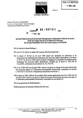 Portant fixation des prix de journée hébergement et dépendance 2002 de la section soins de longue durée de la maison du Diaconat du Groupe hospitalier privé du centre Alsace à Colmar Resumé Pièces jointes ARRETE Assemblée : Non défini Date : 04/03/2002 Rapporteur : Non défini Collectivité : Conseil départemental du Haut-Rhin Direction : Non défini Service : Service de la Tarification des Etablissements Domaine : Prix de Journée Commission :