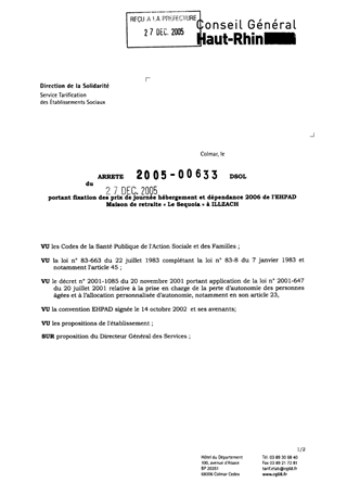 portant fixation des prix de journée hébergement et dépendance 2006 à l'EHPAD maison de retraite "Le Séquoia" à ILLZACH. Resumé Pièces jointes ARRETE Assemblée : Non défini Date : 27/12/2005 Rapporteur : Non défini Collectivité : Conseil départemental du Haut-Rhin Direction : Non défini Service : Service de la Tarification des Etablissements Domaine : Prix de Journée Commission :
