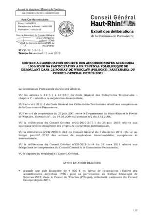 Dans le cadre du dispositif de soutien à l’intégration des nouveaux Etats membres dans l’Union européenne, adopté par le Conseil Général le 25 juin 2010, il vous est proposé d'attribuer une subvention départementale de 4 830 € à l’association « Société des Accordéonistes Accordina 1936 » pour la participation de cette dernière à un festival folklorique dans le Powiat de Wroclaw (Pologne), collectivité partenaire du Conseil Général depuis 2001.