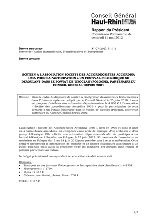 SOUTIEN A L'ASSOCIATION SOCIETE DES ACCORDEONISTES ACCORDINA 1936 POUR SA PARTICIPATION A UN FESTIVAL FOLKLORIQUE SE DEROULANT DANS LE POWIAT DE WROCLAW (POLOGNE), PARTENAIRE DU CONSEIL GENERAL DEPUIS 2001