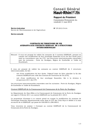Il vous est proposé de valider les avenants de 3 contrats GERPLAN, prenant en compte une modification de leur enveloppe financière et/ou de leur durée pour mise en concordance avec les CTV. Les structures intercommunales concernées sont les suivantes : Porte du Sundgau, Région de Guebwiller et Vallée de Hundsbach.