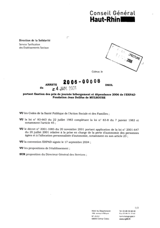 portant fixation des prix de journée hébergement et dépendance 2006 de l'EHPAD Fondation Jean Dollfus de MULHOUSE. Resumé Pièces jointes ARRETE Assemblée : Non défini Date : 04/01/2006 Rapporteur : Non défini Collectivité : Conseil départemental du Haut-Rhin Direction : Non défini Service : Service de la Tarification des Etablissements Domaine : Prix de Journée Commission :