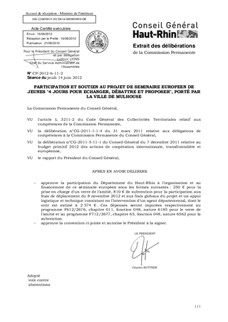 Il vous est proposé de participer et de soutenir le projet de séminaire européen de jeunes "4 jours pour échanger, débattre et proposer", porté par la Ville de Mulhouse. Il s'inscrit dans le cadre du programme européen Jeunesse en Action et vise à faire travailler les jeunes sur 3 thématiques et à favoriser le dialogue avec les élus locaux. La participation du Département à ce projet impliquerait un soutien à hauteur de 1 060 € ainsi qu'une aide à l'ingénierie de projet.