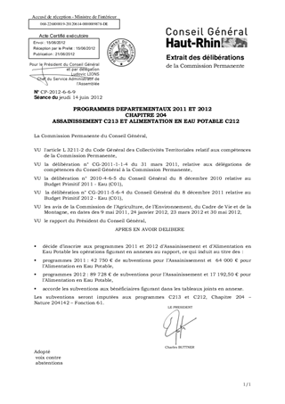 Après examen par la Commission de l'Agriculture, de l 'Environnement, du Cadre de Vie et de la Montagne des dossiers présentés en 2011 et 2012, il vous est proposé de programmer les opérations dont l'ordre de service nous est parvenu et qui figurent en annexes au rapport, ce qui induit au titre des - programmes 2011: un montant de subventions de 42 750 € pour l'Assainissement et de 64 000 € pour l'Alimentation en Eau Potable, - programmes 2012: un montant de subventions de 89 728 € pour l'Assainissement et de 17 192,50 € pour l'Alimentation en Eau Potable.