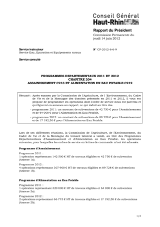 PROGRAMMES DEPARTEMENTAUX 2011 ET 2012 CHAPITRE 204 ASSAINISSEMENT C213 ET ALIMENTATION EN EAU POTABLE C212