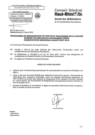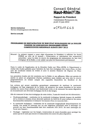 PORGRAMME DE RESTAURATION DU BON ETAT ECOLOGIQUE DE LA DOLLER THUR - DOSSIER DE SUBVENTION PROGRAMME FEDER COMPETITIVITE REGIONALE ALSACE 2007-2013. Resumé Pièces jointes DELIBERATION RAPPORT Assemblée : Commission Permanente Date : 14/06/2012 Rapporteur : Non défini Collectivité : Conseil départemental du Haut-Rhin Direction : Non défini Service : Service Aménagement des Rivières Domaine : Environnement Commission : Commission Permanente