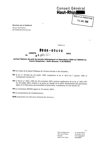 portant fixation des prix de journée hébergement et dépendance 2006 de l'EHPAD du centre hospitalier "Saint Morand" à ALTKIRCH. Resumé Pièces jointes ARRETE Assemblée : Non défini Date : 04/01/2006 Rapporteur : Non défini Collectivité : Conseil départemental du Haut-Rhin Direction : Non défini Service : Service de la Tarification des Etablissements Domaine : Prix de Journée Commission :