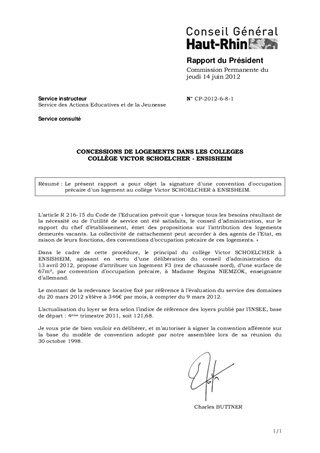 Le présent rapport a pour objet la signature d'une convention d'occupation précaire d'un logement au collège Victor SCHOELCHER à ENSISHEIM.