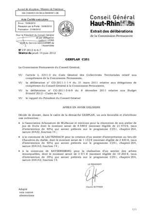 Dans le cadre de la démarche GERPLAN, le Département est sollicité pour : - la modernisation de l’atelier de jus de fruits de l’association Arbonature de DIDENHEIM, - la création d’un sentier d’interprétation au lieu-dit Chaudron du diable à LAUTENBACH, - la réalisation d’un sentier des arbres remarquables à KAYSERSBERG. Il vous est proposé de financer ces demandes pour un montant total de 13.291 €.