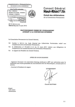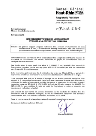 RACCORDEMENT FERRE DE L'EUROAIRPORT - AVENANT A LA CONVENTION INTERREG Resumé Pièces jointes DELIBERATION RAPPORT Assemblée : Commission Permanente Date : 14/06/2012 Rapporteur : Non défini Collectivité : Conseil départemental du Haut-Rhin Direction : Non défini Service : Mission des Grands Equipements Domaine : Transports / Routes Commission : Commission Permanente
