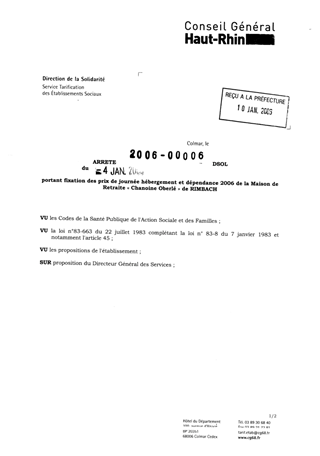 portant fixation des prix de journée hébergement et dépendance 2006 de la maison de retraite "Chanoine Oberlé" de RIMBACH. Resumé Pièces jointes ARRETE Assemblée : Non défini Date : 04/01/2006 Rapporteur : Non défini Collectivité : Conseil départemental du Haut-Rhin Direction : Non défini Service : Service de la Tarification des Etablissements Domaine : Prix de Journée Commission :