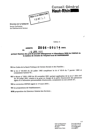portant fixation des prix de journée hébergement et dépendance 2006 de l'EHPAD de la maison de retraite de l'hôpital de DANNEMARIE. Resumé Pièces jointes ARRETE Assemblée : Non défini Date : 09/01/2006 Rapporteur : Non défini Collectivité : Conseil départemental du Haut-Rhin Direction : Non défini Service : Service de la Tarification des Etablissements Domaine : Prix de Journée Commission :