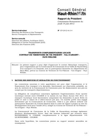 Le présent rapport a pour objet d'approuver le contrat thématique transports, pour l'organisation par la Communauté de Communes de la Vallée de Kaysersberg d'un transport à la demande, avec la participation financière du Département du Haut-Rhin, prévue au Contrat de Territoire de Vie Piémont - Val d'Argent - Pays Welche.