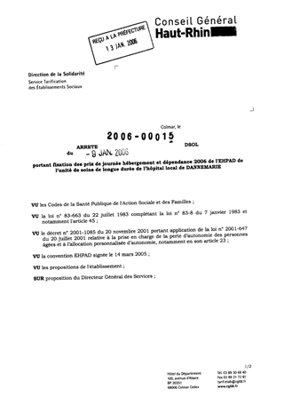 portant fixation des prix de journée hébergement et dépendance 2006 de l'EHPAD de l'unité de soins de longue durée de l'hôpital local de DANNEMARIE. Resumé Pièces jointes ARRETE Assemblée : Non défini Date : 09/01/2006 Rapporteur : Non défini Collectivité : Conseil départemental du Haut-Rhin Direction : Non défini Service : Service de la Tarification des Etablissements Domaine : Prix de Journée Commission :