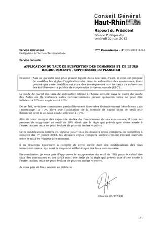 APPLICATION DU TAUX DE SUBVENTION DES COMMUNES ET DE LEURS REGROUPEMENTS - SUPPRESSION DU PLANCHER