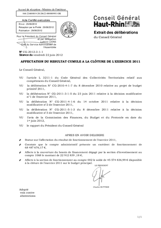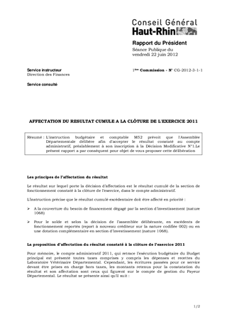 L'instruction budgétaire et comptable M52 prévoit que l'Assemblée Départementale délibère afin d'accepter le résultat constaté au compte administratif, préalablement à son inscription à la Décision Modificative N°1.Le présent rapport a par conséquent pour objet de vous proposer cette délibération