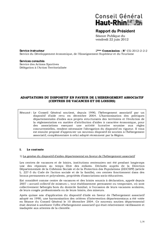 Le Conseil Général soutient, depuis 1990, l’hébergement associatif par un dispositif d’aide revu en décembre 2004. L’harmonisation des politiques départementales d’aides aux projets structurants des territoires et l’évolution de la réglementation en matière d’attribution d’aides à caractère économique, pour des associations exerçant une activité lucrative soumise aux règles concurrentielles, rendent nécessaire l’abrogation du dispositif en vigueur. Il vous est ensuite proposé d’approuver un nouveau dispositif de soutien à l’hébergement associatif, complémentaire à celui adopté récemment par la Région.