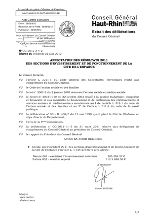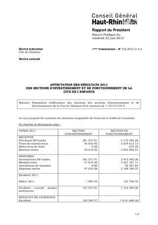 AFFECTATION DES RÉSULTATS 2011 DES SECTIONS D'INVESTISSEMENT ET DE FONCTIONNEMENT DE LA CITE DE L'ENFANCE