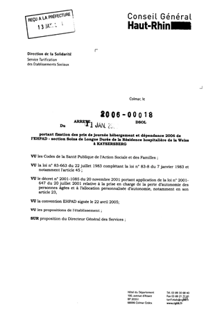 portant fixation des prix de journée hébergement et dépendance 2006 de l'EHPAD - section de soins longue durée de la résidence hospitalière de la Weiss à KAYSERSBERG. Resumé Pièces jointes ARRETE Assemblée : Non défini Date : 11/01/2006 Rapporteur : Non défini Collectivité : Conseil départemental du Haut-Rhin Direction : Non défini Service : Service de la Tarification des Etablissements Domaine : Prix de Journée Commission :
