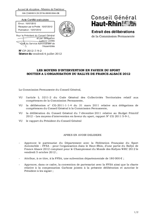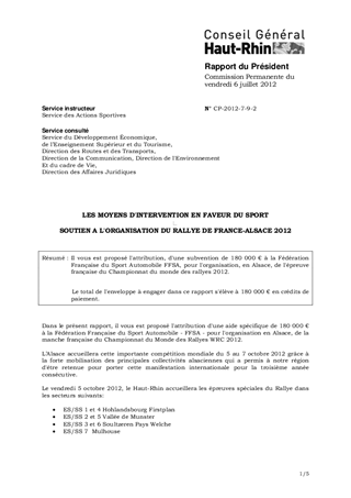 LES MOYENS D'INTERVENTION EN FAVEUR DU SPORT SOUTIEN A L'ORGANISATION DU RALLYE DE FRANCE-ALSACE 2012