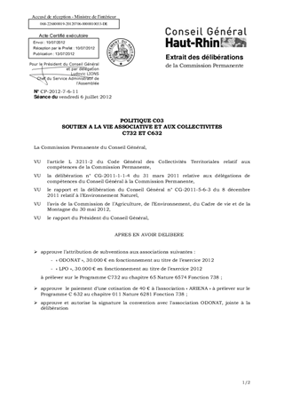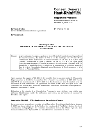 Le présent rapport propose, après avis favorable de la Commission de l'Agriculture de l'Environnement, du Cadre de Vie et de la Montagne du 30 mai 2012, l’attribution d’une subvention de fonctionnement de 30 000 € à l’Office des Données Naturalistes d’Alsace (ODONAT) et de 30 000 € à la Ligue pour Protection des Oiseaux (LPO) dans le cadre de la politique de « Soutien à la Vie Associative et aux Collectivités » , ainsi que le paiement de la cotisation annuelle, fixée à 40 €, à l’Association Régionale pour l’Initiation à l’Environnement et à la Nature en Alsace (ARIENA).