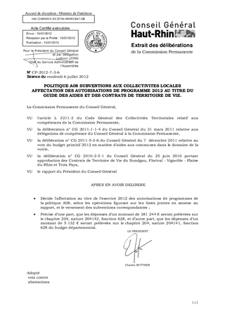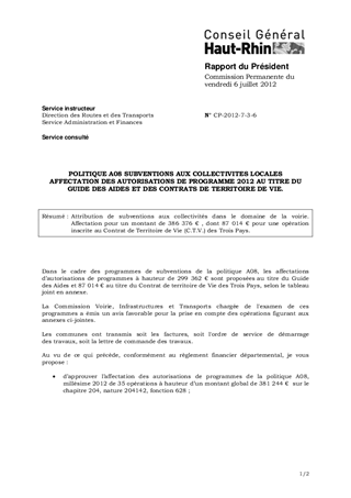 POLITIQUE A08 SUBVENTIONS AUX COLLECTIVITES LOCALES AFFECTATION DES AUTORISATIONS DE PROGRAMME 2012 AU TITRE DU GUIDE DES AIDES ET DES CONTRATS DE TERRITOIRE DE VIE.