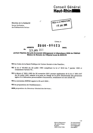 portant fixation des prix de journée hébergement et dépendance 2006 de l'EHPAD maison de retraite de l'hôpital local de SOULTZ. Resumé Pièces jointes ARRETE Assemblée : Non défini Date : 13/01/2006 Rapporteur : Non défini Collectivité : Conseil départemental du Haut-Rhin Direction : Non défini Service : Service de la Tarification des Etablissements Domaine : Prix de Journée Commission :