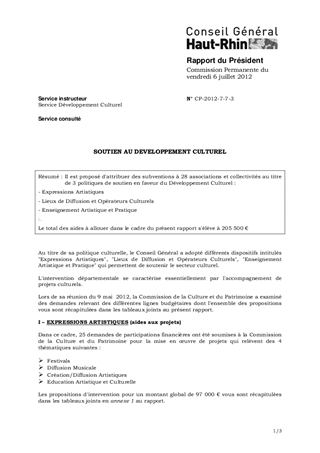 Il est proposé d'attribuer des subventions à 28 associations et collectivités au titre de 3 politiques de soutien en faveur du Développement Culturel : - Expressions Artistiques - Lieux de Diffusion et Opérateurs Culturels - Enseignement Artistique et Pratique Le total des aides à allouer dans le cadre du présent rapport s'élève à 205 500 €