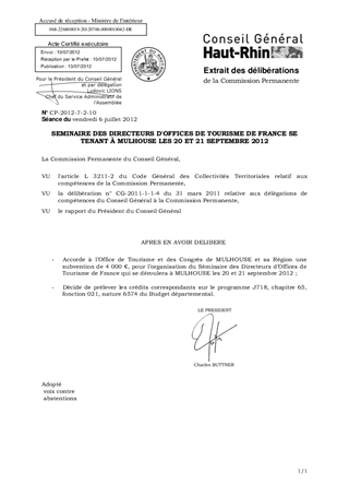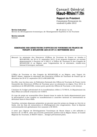 SEMINAIRE DES DIRECTEURS D'OFFICES DE TOURISME DE FRANCE SE TENANT À MULHOUSE LES 20 ET 21 SEPTEMBRE 2012