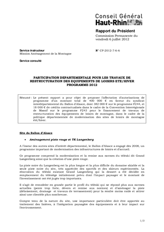 Le présent rapport a pour objet de proposer l’affectation d’autorisations de programme d’un montant total de 400 000 € en faveur du syndicat interdépartemental du Ballon d'Alsace, dont 382 000 € sur le programme F244, et 18 000 € de crédits contractualisés dans le cadre de la Convention Interrégionale de Massif sur le programme F243 pour le financement de travaux de restructuration des équipements de loisirs de montagne, dans le cadre de la politique départementale de modernisation des sites de loisirs de montagne été/hiver.