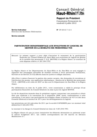 Le présent rapport a pour objet d’autoriser le versement de la participation financière du Conseil Général du Haut-Rhin aux évolutions du logiciel de gestion de la mobilité des personnels T .O.S. (MOTOS) à la Région Alsace. Le montant de cette dépense s’élève à 4 207.59 € TTC.