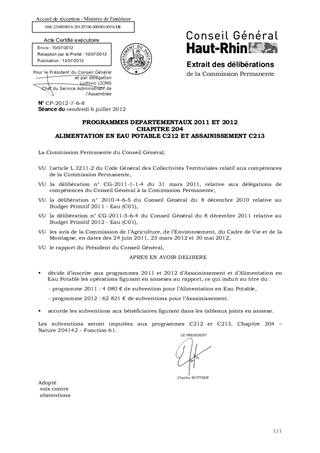 Après examen par la Commission de l'Agriculture, de l 'Environnement, du Cadre de Vie et de la Montagne des dossiers présentés en 2011 et 2012, il vous est proposé de programmer les opérations dont l'ordre de service nous est parvenu et qui figurent en annexes au rapport, ce qui induit au titre du: - programme 2011: un montant de subvention de 4 080 € pour l'Alimentation en Eau Potable, - programme 2012: un montant de subventions de 62 821 € pour l'Assainissement.
