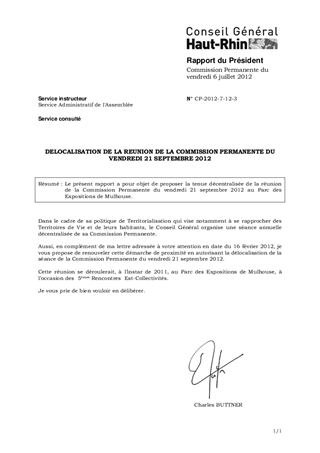 Le présent rapport a pour objet de proposer la tenue décentralisée de la réunion de la Commission Permanente du vendredi 21 septembre 2012 au Parc des Expositions de Mulhouse.