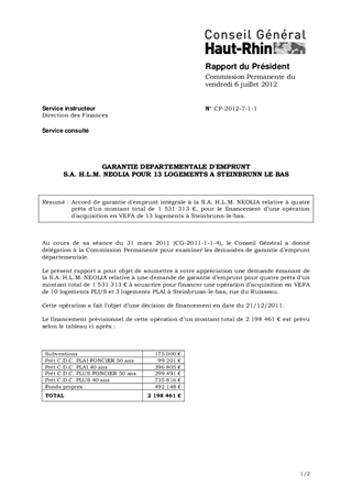 GARANTIE DEPARTEMENTALE D'EMPRUNT S.A. H.L.M. NEOLIA POUR 13 LOGEMENTS A STEINBRUNN LE BAS