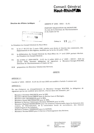 portant délégation de signature au sein de la Direction de l'Environnement e du Cadre de Vie. Resumé Pièces jointes ARRETE Assemblée : Non défini Date : 19/01/2006 Rapporteur : Non défini Collectivité : Conseil départemental du Haut-Rhin Direction : Non défini Service : Service Juridique Domaine : Organisation Interne Commission :