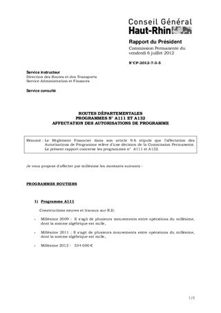Le Règlement Financier dans son article 9.6 stipule que l’affectation des Autorisations de Programme relève d’une décision de la Commission Permanente. Le présent rapport concerne les programmes n° A111 et A132.