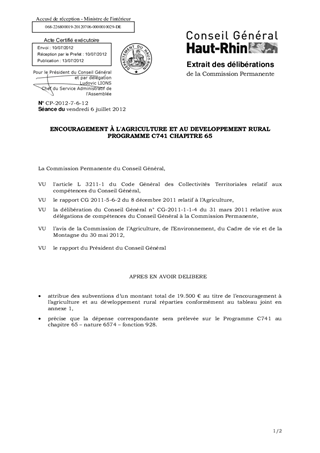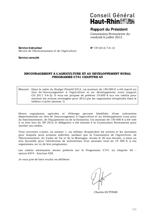 Dans le cadre du Budget Primitif 2012, un montant de 150.000 € a été inscrit au titre de l’encouragement à l’agriculture et au développement rural (rapport CG 2011 5-6-2). Il vous est proposé de prélever 19.500 € sur ces crédits pour soutenir les actions envisagées pour 2012 par les organismes récapitulés dans le tableau ci-joint (annexe 1).
